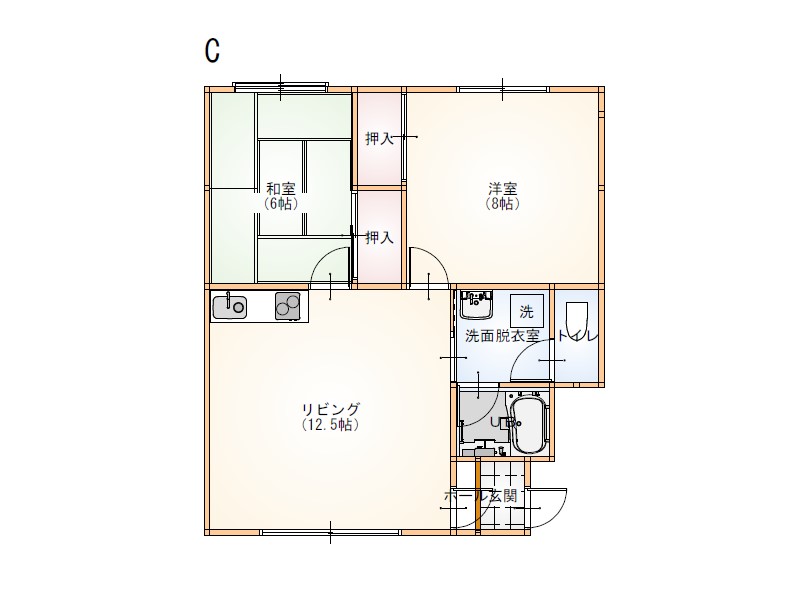 2LDK(居間台所12.5帖、洋室8帖、和室6帖) -